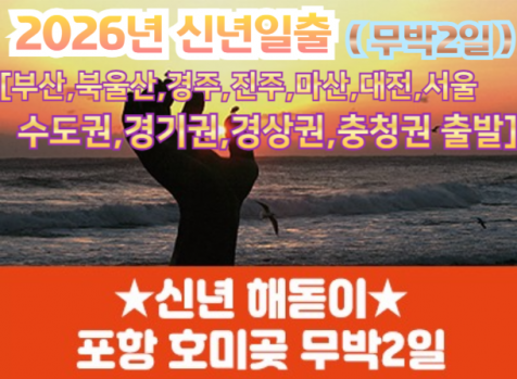 상품코드 9932 [수도권/경기권/충청권/경상권출발] [ 2026년 신년해돋이] 2026년 호미곶 신년해맞이 (무박2일) 12/31출발 -단1회 [부산,북울산,신경주,진주,마산,대전,서울] 출발일 달력에서 출발일을 선택해주세요. 상품가격 136,000원 (대인) 123,000원 (소인) 최소출발인원 20명 기차역별 요금이 상이합니다 마감이 탑승지별 차이가 있습니다