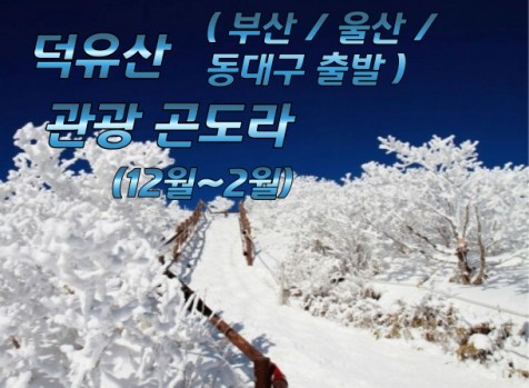 | 덕유산 | 곤도라 | 12:50 | 덕유산 향적봉 곤도라(왕복제공) - 해발1,614m 덕유산 정상(향적봉) 의 환상적인 풍경 감상 - 곤도라 하차 후 설천봉에서 향적봉까지(20여분 소요됨) - 설천봉과 향적봉까지 나무계단 따라 상고대와 눈꽃도 놓치지 마세요~ - 감탄이 절로 나오는 천년주목 * 덕유산 곤도라(약 15분 소요) 왕복제공 (편도 이용시 요금환불 없음) ※곤도라 탑승시 대기시간이 길어질 수 있으니 미리 준비하시기 바랍니다.