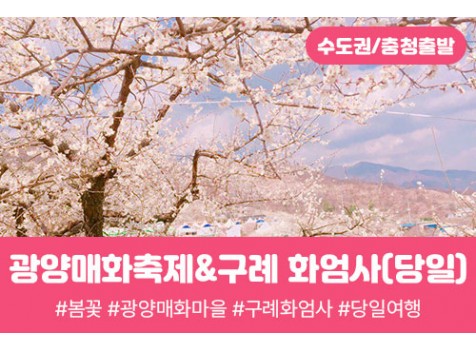 상품코드 8174 [수도권/충청권/전라권/경상권出] ★봄꽃★[ 광양매화축제 / 구례 화엄사(당일) [구례역왕복] 출발일 달력에서 출발일을 선택해주세요. 상품가격 128,000원 (대인) 112,000원 (소인) 최소출발인원 15명 기차역별 요금이 상이합니다 KTX 열차 (주말)조기마감예상