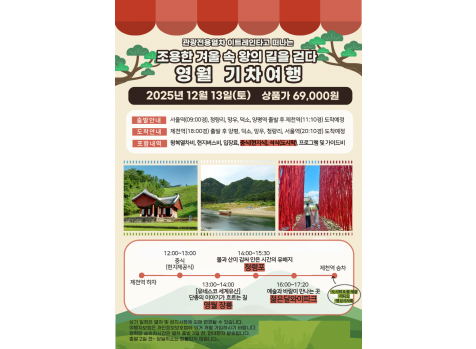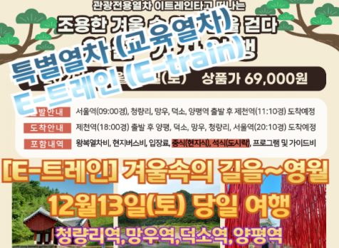 상품코드 3415 [특별열차-E-트레인] 관광열차타고 조용한 겨울속 길을걷다~ 영월기차여행 [당일] [12월13일토 ] [서울역,청량리역,덕소역,양평역] 출발일 달력에서 출발일을 선택해주세요. 상품가격 69,000원 (대인) 69,000원 (소인) 최소출발인원 특별열차 [E-트레인]