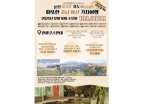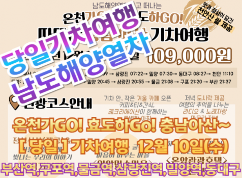상품코드 3416 [부산,구포,물금,밀양,동대구출발] [남도해양열차] 온천가GO! 효도가GO! 충남아산기차여행 [당일] [12월10일수 ] 출발일 달력에서 출발일을 선택해주세요. 상품가격 109,000원 (대인) 109,000원 (소인) 최소출발인원 40명 남도해양열차