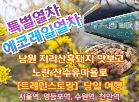 [07:00~10:45] [에코레일 4511열차] 서울역 출발 ~ 남원역 도착 (서울역07:00, 영등포역07:15, 수원역07:40, 천안역08:15, 서대전역09:00 출발) ※ 열차시간은 변동될 수 있으며, 출발 2~3일 전 확정될 예정입니다.