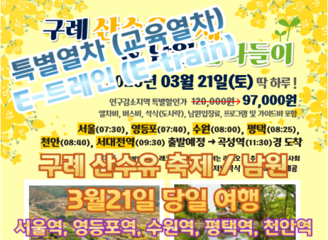 상품코드 3472 마감- [특별열차-E-트레인] 관광열차타고 구례산수유축제 /남원 으로 떠나자! [당일] 3월21일 [ 서울역,영등포역,수원역,평택역,찬안역,서대전역 ] 출발일 달력에서 출발일을 선택해주세요. 상품가격 97,000원 (대인) 97,000원 (소인) 최소출발인원 특별열차 [특별열차-E-트레인]