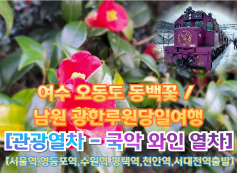 상품코드 9429 [국악와인열차-당일] 여수 오동도 동백꽃 / 남원 광한루원 (당일) 3월 15,17일 [서울역, 영등포역, 수원역, 평택역, 천안역, 서대전역] 출발일 달력에서 출발일을 선택해주세요. 상품가격 179,000원 (대인) 169,000원 (소인) [국악와인열차] 3월 22일(일) 마감