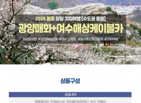 상품코드 8172 [수도권/충정권/전라권出] ★봄꽃★[수도권/대전 출발]광양매화마을 / 여수 오동도 동백꽃, 케이블카(당일) 출발일 달력에서 출발일을 선택해주세요. 상품가격 158,000원 (대인) 137,000원 (소인) 최소출발인원 15명 기차역별 요금이 상이합니다 KTX 열차 (주말)조기마감예상