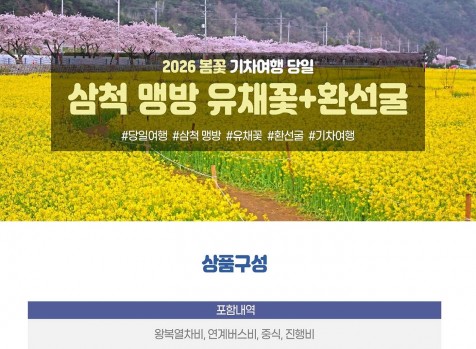 상품코드 8119 [수도권,충청권,경상권] [동해해변열차] 삼척 맹방 유채꽃 / 환선굴 (당일) [청량리역,대전역,부전역,태화강역,북울산역,포항역,경주역,동대구역] 출발일 달력에서 출발일을 선택해주세요. 상품가격 121,000원 (대인) 106,000원 (소인) 최소출발인원 13명 - 한달전 예약은 대기예약입니다 - 기차역별 요금이 상이합니다 - 탑승지별 마감이 다릅니다