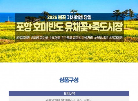 상품코드 8120 [수도권,충청권,경상권] 포항 호미반도 유채꽃 / 죽도시장(당일) [서울역,대전역,동대구역,부산역,부전역,울산역,마산역] 출발일 달력에서 출발일을 선택해주세요. 상품가격 122,000원 (대인) 104,000원 (소인) 최소출발인원 15명 - 한달전 예약은 대기예약입니다 - 기차역별 요금이 상이합니다 - 탑승지별 마감이 다릅니다